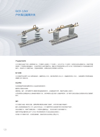 GCD 隔离开关是户外柱上单相隔离开关,它为维护人员提供一个可见断口,也可以作为一个分断点。其结构为双柱式隔离开关,绝缘子及螺