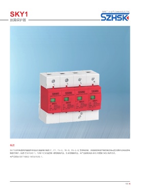 SKY1 深圳三开电气 sankai electric 浪涌保护器 概述 SKY1 系列电涌保护器适用于低压交流配电系统的 IT、TT、TN-C、TN-S、TN-C-S, 等供电系统,对间接雷电和直接雷电影响或其它瞬时过电压的电 涌进行保护。依据 IEC61643-1:1998-02 标准的第 l 级电涌保护器。B 类电涌保护器。本产品具有共模 (MC) 和差模 (MD) 保护方式。 本产品符合 GB/T18802.1/IEC61643-1。 100