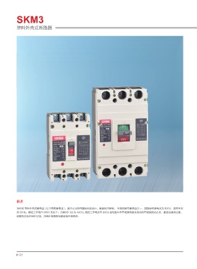SKM3 塑料外壳式断路器 概述 SKM3 塑料外壳式断路器 ( 以下简称断路器 ),是本公司采用国际先进设计、制造技术研制、 开发的新型断路器之一。其额定绝缘电压为 800V,适用于交 流 50Hz,额定工作电压 690V 及以下,(SKM3-63 为 400V), 额定工作电流至 800A 的电路中作不频繁转换及电动机不频繁起动之用。断路器具有过载、 短路和欠电压保护功能,能保护线路和电源设备不受损坏。 021